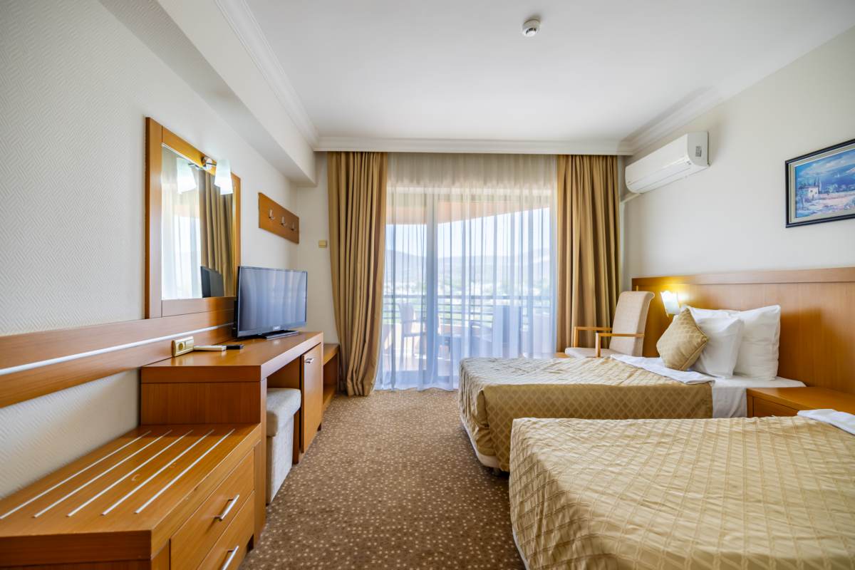 Kara Manzaralı Standart Oda, tesisin bahçe veya doğal çevre manzarasına bakan balkonuyla sakinlik arayan misafirler için ideal bir konaklama seçeneğidir. 22 metrekare genişliğindedir ve maksimum 2+1 kişi kapasiteye sahiptir. Odada split klima, mini bar, duş & banyo, telefon ve ücretli emanet kasa bulunur. Konforlu ve sade tasarımıyla aile ve çift konaklamaları için uygundur.